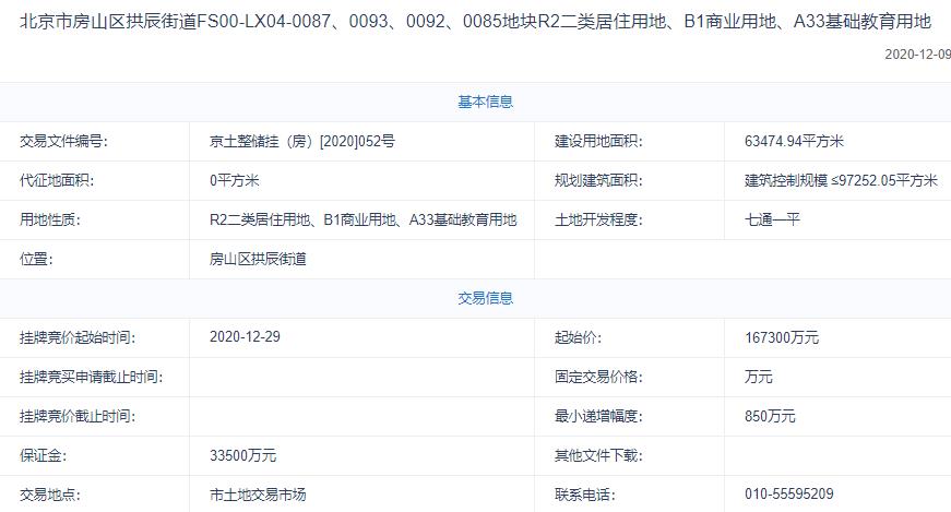 地塊編號京土整儲掛(房)[2020]052號,地塊名稱為北京市房山區拱辰街道FS00-LX04-0087、0093、0092、0085地塊R2二類居住用地、B1商業用地、A33基礎教育用地,建設用地面積6.35萬平,規劃建築面積 ≤97252.05平方米,土地用途為R2二類居住用地、B1商業用地、A33基礎教育用地,起始價16.73億元。