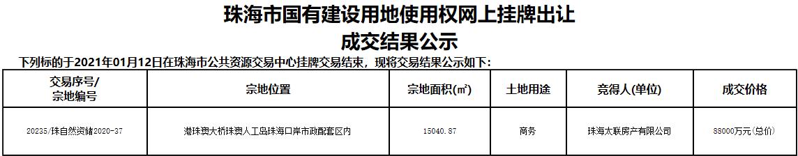 地塊編號20235/珠自然資儲2020-37,地塊位於港珠澳大橋珠澳人工島珠海口岸市政配套區內,宗地面積1.5萬平,土地用途為商務用地,起始價8.8億元。