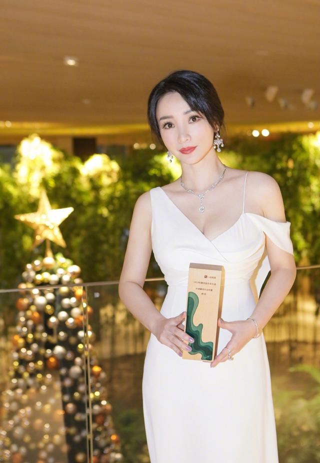 柳岩自帶焦點感,白色露肩裙優雅性感
