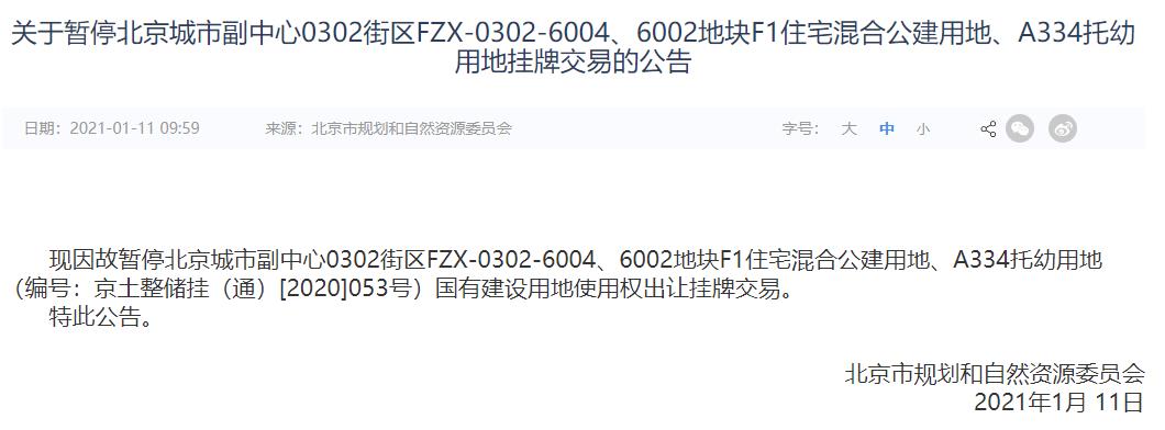 現因故暫停北京城市副中心0302街區FZX-0302-6004、6002地塊F1住宅混合公建用地、A334托幼用地(編號:京土整儲掛(通)[2020]053號)國有建設用地使用權出讓掛牌交易。