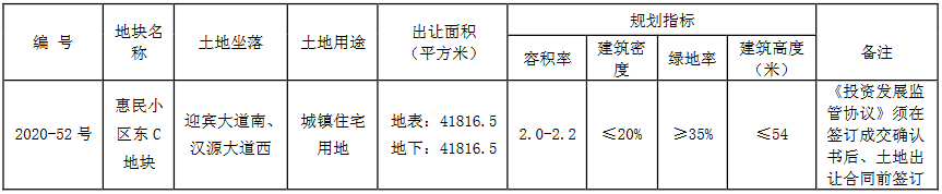 資料显示,該地塊編號為2020-52號,位於迎賓大道南、漢源大道西。出讓面積41816.5㎡,起始價5.08億元,建築密度≤20%,率≥35%,建築高度≤54米。