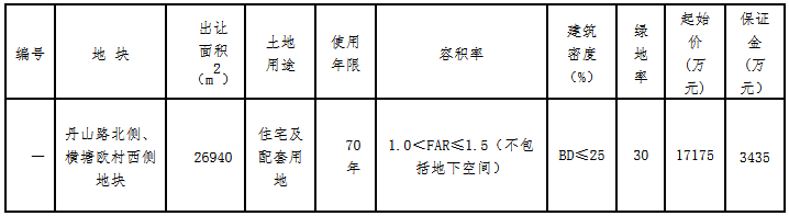 資料显示,該地塊編號為象自然資規出告字〔2020〕18號,位於象山縣丹山路北側、橫塘歐村西側。出讓面積26940㎡,起始價1.72億元,競買保證金3435萬元,建築密度≤25%,率30%。