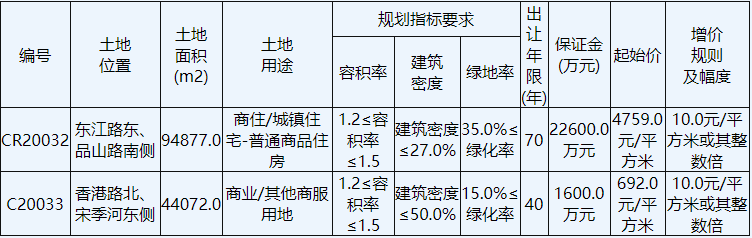 地塊編號CR20032,地塊名稱為海門區東江路東、品山路南側地塊,出讓面積9.49萬平,土地用途為商住用地,容積率1.5,建築面積14.23萬平,起始價4.52億元。