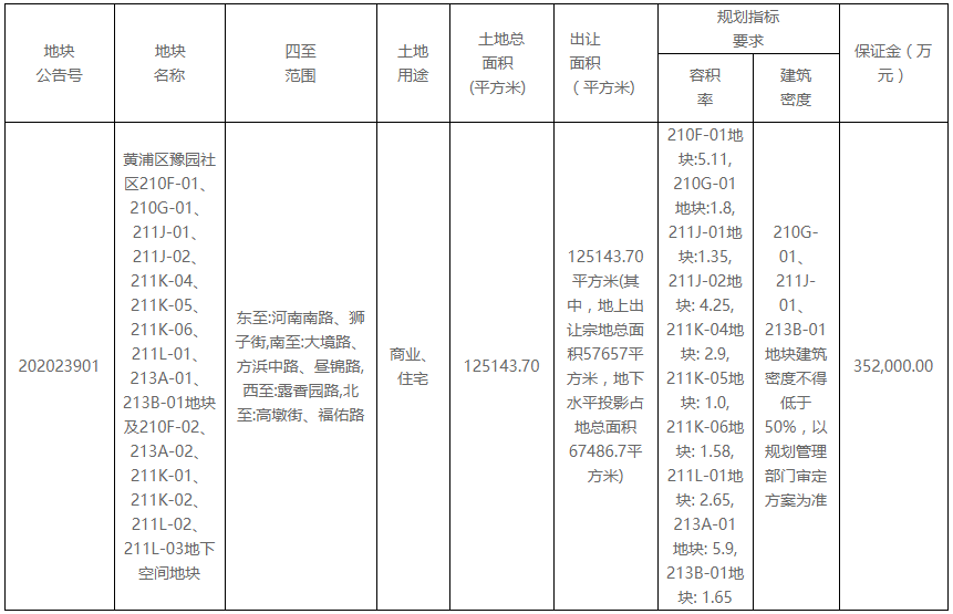 資料显示,該地塊編號為202023901,位於黃浦區豫園社區,東至河南南路、獅子街,南至大境路、方浜中路、晝錦路,西至露香園路,北至高墩街、福佑路。