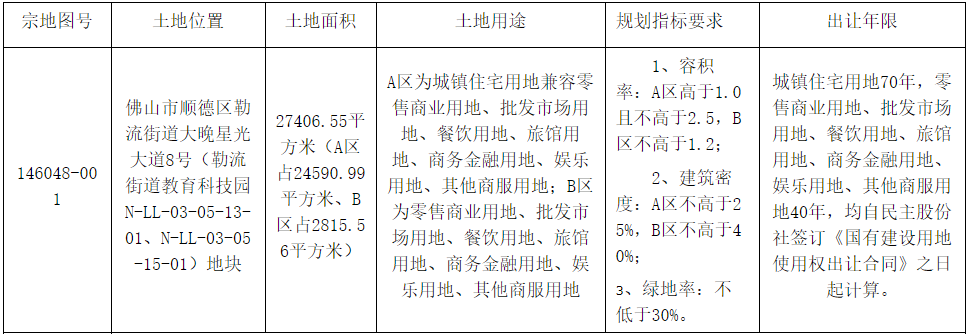 資料显示,該地塊編號為TD2020(SD)XG0018,位於順德區勒流街道大晚星光大道8號(勒流街道教育科技園N-LL-03-05-13-01、N-LL-03-05-15-01)地塊。