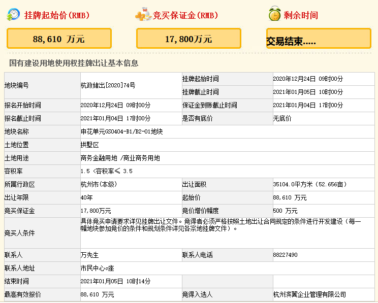 杭州濱翼企業管理有限公司(濱江集團)以底價8.86億元競得拱墅區申花單元GS0404-B1/B2-01地塊,樓麵價7212元/㎡。