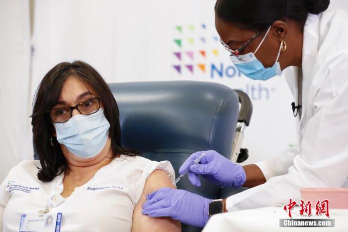 資料圖:當地時間12月14日,紐約長島猶太醫療中心護士史蒂芬妮接種新冠疫苗。 中新社記者 廖攀 攝