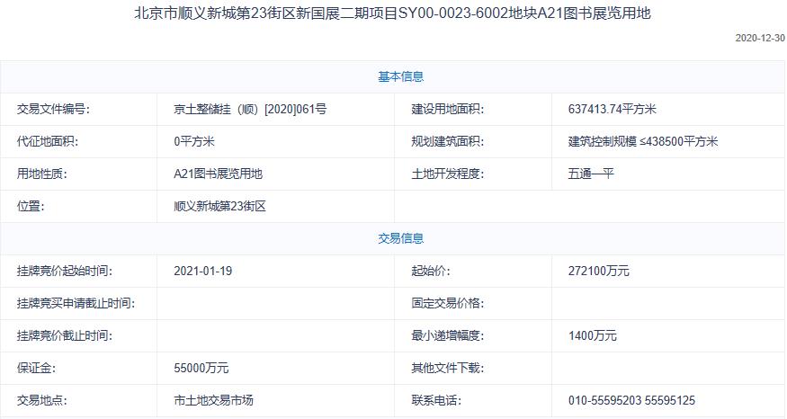 地塊編號京土整儲掛(順)[2020]061號,地塊名稱為北京市順義新城第23街區新國展二期項目SY00-0023-6002地塊,建設用地面積63.74萬平,規劃建築面積 ≤438500平方米,土地用途為A21圖書展覽用地,地塊位於順義新城第23街區,起始價27.21億元。