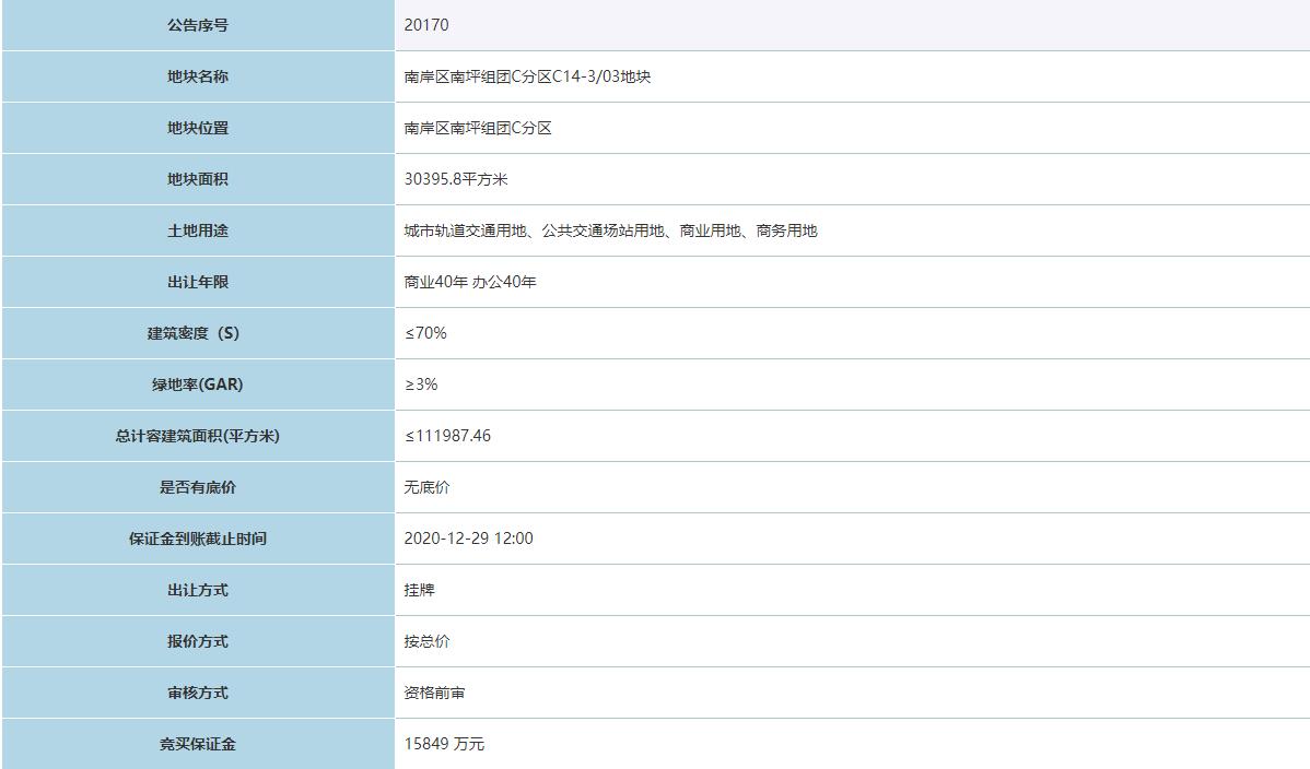 地塊編號20170,地塊名稱為南岸區南坪組團C分區C14-3/03地塊,地塊位於南岸區南坪組團C分區,地塊面積3.04萬平,土地用途為城市軌道交通用地、公共交通場站用地、商業用地、商務用地,起始價7.92億元。