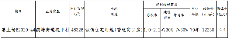 資料显示,該地塊位於嘉善縣魏塘街道魏中村。出讓面積48326㎡,起始價59102.7萬元,競買保證金2.4億元,建築密度≤30%,率≥30%,建築高度24-80米。