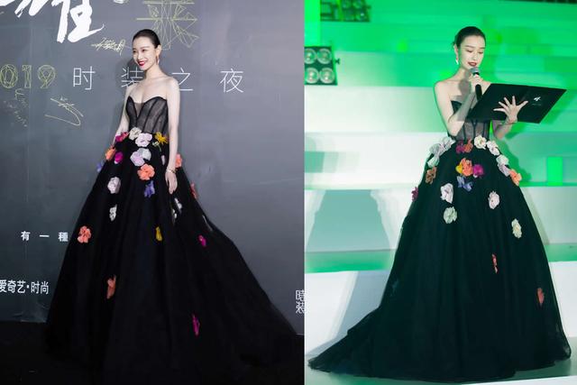▲這是出席時尚雜誌活動時穿的黑色抹胸禮服長裙,這條黑色的裙子非好看,胸口的造型如蝴蝶,裙擺上綴滿大朵的立體花朵,浪漫甜美又大氣高貴。頭髮簡單的盤起來,大紅唇很搶鏡,優雅又有女人味,很有魅力。