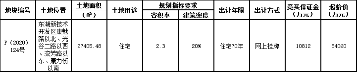 資料显示,該地塊位於東湖新技術開發區康魅路以北、光谷二路以西、流芳路以東、康力街以南。出讓面積27405.48㎡,起始價54060萬元,競買保證金10812萬元,建築密度20%。