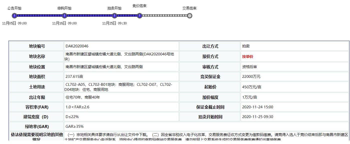 地塊編號DAK2020046,地塊位於南昌市新建區望城鎮宏福大道北側、文台路兩側,地塊面積237.615畝,用地性質為CL702-A05、CL702-B01地塊:商服用地;CL702-D07、CL702-D04地塊:住宅、商服用地,容積率1.0<FAR≤2.6;建築密度D≤22%;率GAR≥35%。