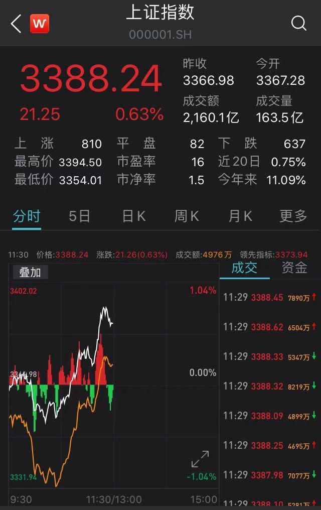截至午間收盤,滬指報3388.24點,漲幅0.63%,成交額2160.06億元;深成指報13851.29點,漲幅0.73%,成交額2554.29億元;創業板指報2777.98點,漲幅0.63%;上證50指數報3523.69點,漲幅1.1%。