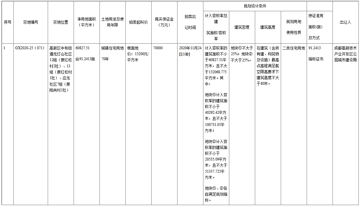 資料显示,該地塊編號為GX2020-25(071),位於高新區中和街道龍燈山社區12組(原紅松村2社)、13組(原紅松村1社)、 應龍社區7組(原陸肖村1社)。凈用地面積60827.51㎡(合91.2413畝),起始價231145萬元,競買保證金7億元。