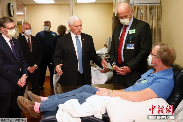 當地時間4月28日,美國副總統彭斯(右二站立者)在視察醫療機構梅奧診所時,因為無視診所規定,在沒有戴口罩的情況下探望病人,引發爭議。