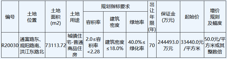 資料显示,該地塊位於通富路東、觀陽路南、洪江東路北。出讓面積73113.72㎡,起始價244492.28萬元,建築密度≤18%,率≥40%,建築高度≤80米。