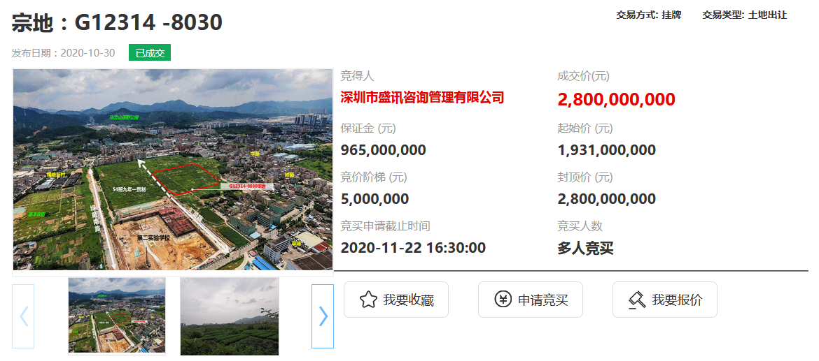 資料显示,該宗地代碼為440307204003GB00252,位於坪山區石井街道綠蔭南路與東縱路交匯處西北角。出讓面積37254.47㎡,起始價19.31億元,競買保證金9.65億元,最高限價28億元。