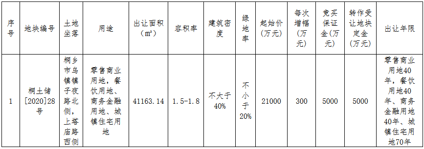 資料显示,該地塊編號為桐土儲[2020]28號,位於桐鄉市烏鎮鎮子夜路北側,上塔廟路西側。出讓面積41163.14㎡,起始價2.1億元,競買保證金5000萬元,最高限價3.15億元,建築密度≤40%,率≥20%,建築高度。