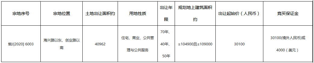資料显示,該地塊編號為煙J[2020] 6003,位於海興路以東、創業路以南。出讓面積40962㎡,起始價3.01億元,建築密度≤20%,率≥35%,建築高度≤80米,地上建築層數≤26層。