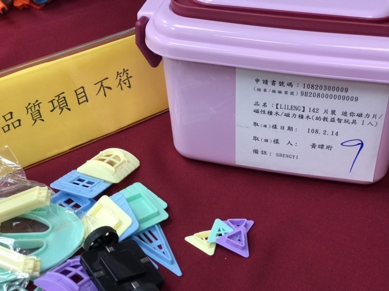 物理性不合格是LILENG142片裝迷你磁力片,該商品未標示適用年齡及使用警語,採3歲以下兒童檢測標準進行檢驗發現,該玩具會完全沒入小朋友開口及喉嚨,有造成兒童誤吞後窒息風險,不符合3歲以下兒童使用規定。依國際經驗,多塊磁性零組件進入孩童身體,也容易造成腸道黏附、扭曲意外。