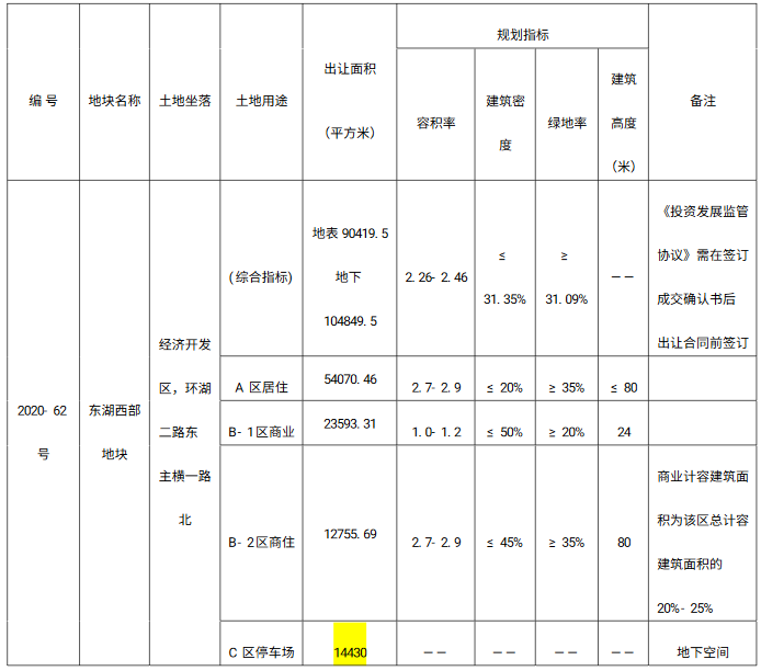 資料显示,該地塊編號為2020-62號,位於經濟開發區,環湖二路東、主橫一路北。出讓面積90419.5㎡,起始價62680萬元,建築密度≤31.35%,率≥31.09%。