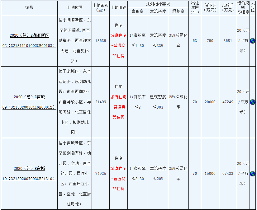 宿遷市裕羅新農村建設有限公司以底價4075.11萬元競得2020(經)E宿城13地塊,樓麵價750元/㎡。