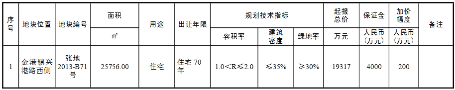 資料显示,該地塊位於金港鎮興港路西側,東至興港路;南至晨豐公路;西至河;北至空地。出讓面積25756㎡,起始價19317萬元,競買保證金4000萬元,建築密度≤35%,率≥30%。