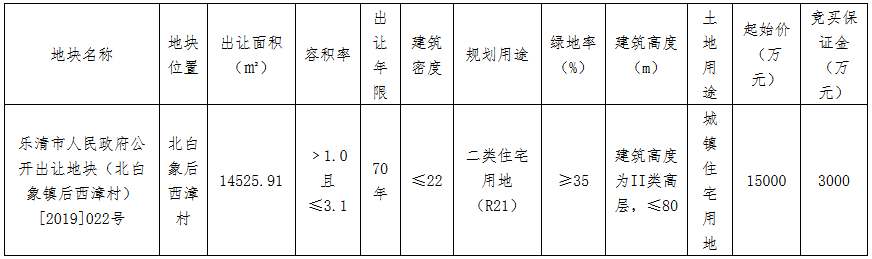 資料显示,該地塊編號為樂資規出讓告字[2020]42號,位於北白象后西漳村。出讓面積14525.91㎡,起始價1.5億元,競買保證金3000萬元,建築密度≤22%,率≥35%,建築高度為II類高層,≤80米。