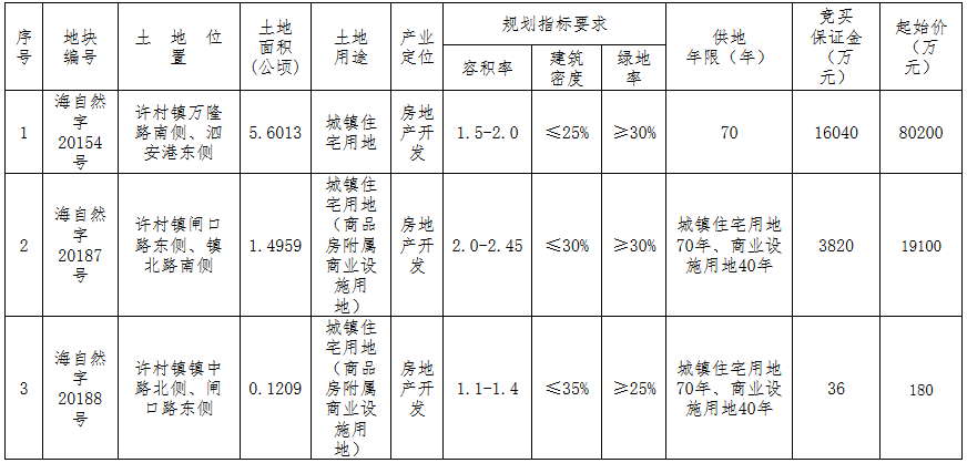 資料显示,該地塊位於許村鎮閘口路東側、鎮北路南側。出讓面積14959㎡,起始價1.91億元,競買保證金3820萬元,建築密度≤30%,綠地率≥30%。