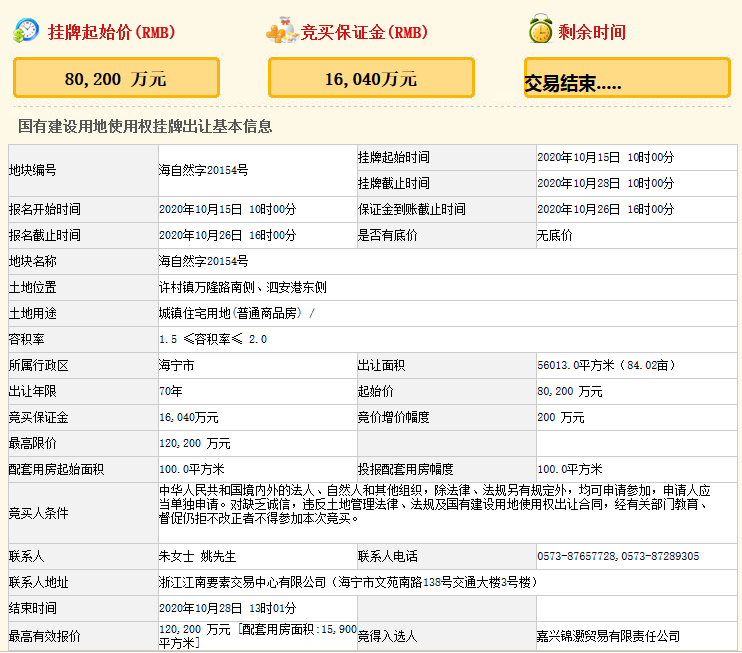 經過135輪競價,嘉興錦灝貿易有限責任公司(新希望)以上限價12.02億元競得海自然字20154號地塊,樓麵價10730元/㎡,溢價率49.88%,競配安置房面積15900㎡。