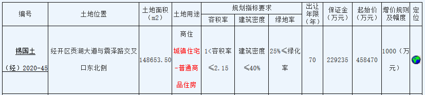 資料显示,該地塊編號為錫國土(經)2020-45,位於經開區貢湖大道與震澤路交叉口東北側。出讓面積138059.5㎡,起始價458470萬元,最高限價為534290 萬元,競買保證金229235萬元,建築密度≤40%,率≥25%,建築高度:住宅建築≥18層,商業建築≤30米,滿足機場凈空要求。