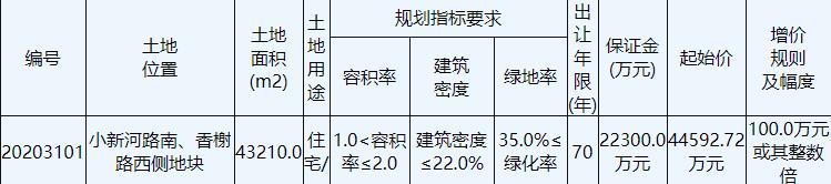 地塊編號20203101,地塊名稱小新河路南、香榭路西側地塊,出讓面積4.32萬平,用途為住宅用地,容積率2,建築面積8.64萬平,起始價4.46億元。
