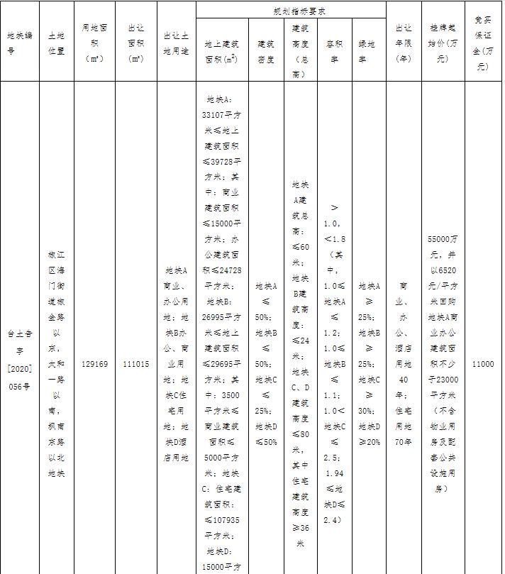 地塊編號台土告字[2020]056號,地塊名稱椒江區海門街道椒金路以東,太和一路以南,楓南東路以北地塊,出讓面積11.1萬平,用途為商住用地,容積率1.76,建築面積19.59萬平,起始價5.5億元。