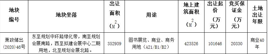 地塊編號蕭政儲出(2020)46號,地塊名稱杭州大會展中心一期項目,地塊東至規劃中環路綠化帶,南至規劃會展南路,西至擬建會展中心二期用地,北至規劃會展北路。出讓面積35.29萬平,用途為商業用地,容積率1.2,建築面積42.35萬平,起始價10.16億元。