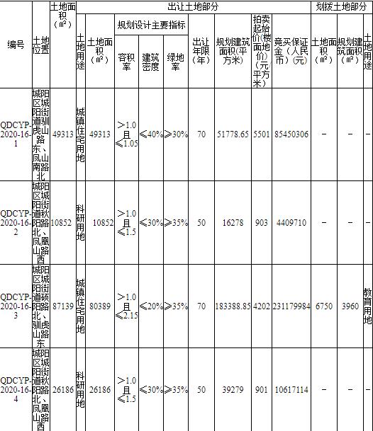 地塊編號QDCYP-2020-16-4號,地塊位於城陽區城陽街道秋陽路北、鳳凰山路西,佔地面積26186㎡,規劃用途為科研用地,容積率>1.0且≤1.5,建築密度≤30%,綠地率≥35%,出讓年限五十年,規劃建築面積39279㎡,起拍價901元/㎡。