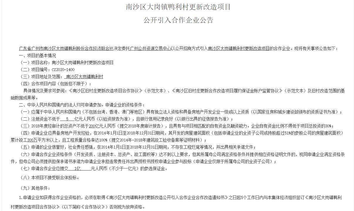 據此前2020年8月31日招標文件显示,項目名稱為南沙區大崗鎮鴨利村更新改造項目,項目編號CZ2020-1400,項目地址及範圍為南沙區大崗鎮鴨利村,位於龍古村以東、昌安工業園以西、順南水道以南、潭洲滘以北,改造範圍的總用地面積約為38.40公頃,合作內容為鴨利村舊村全面改造、舊廠房全面改造。