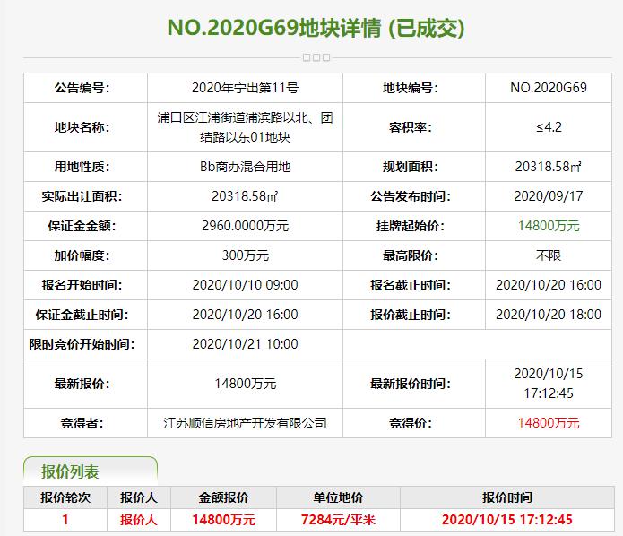 最終江蘇順信開發有限公司以1.48億元競得,樓麵價1734.28元/平。