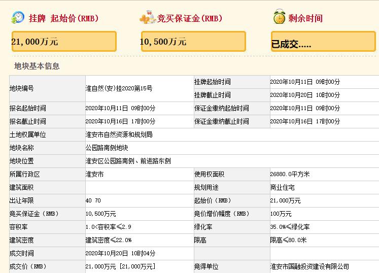 地塊編號淮自然(安)掛2020第15號,地塊名稱為公園路南側地塊,出讓面積2.68萬平,用途為商住用地,容積率2.9,建築面積7.79萬平,起始價2.1億元。