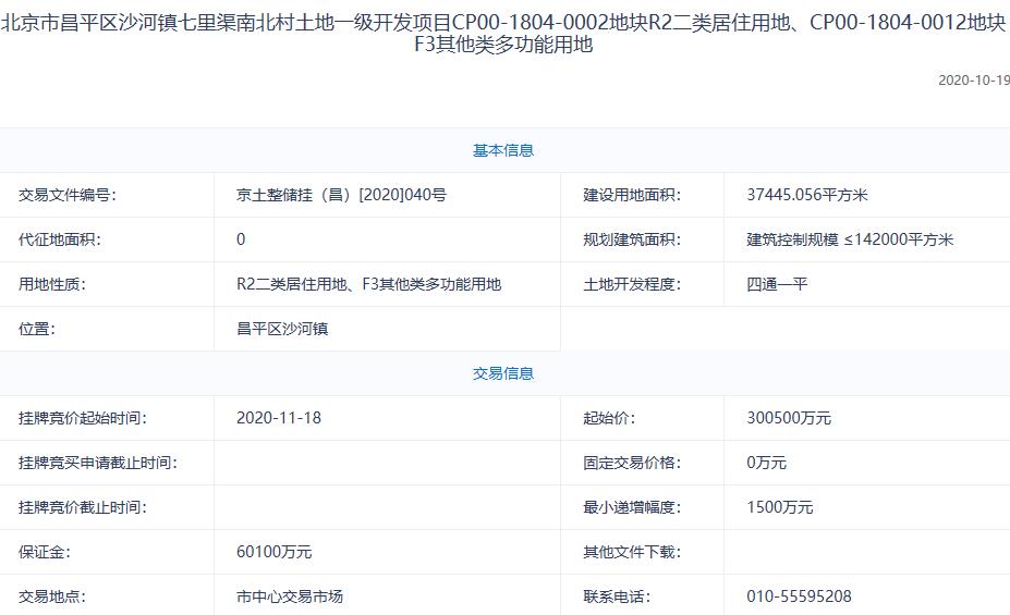地塊編號京土整儲掛(昌)[2020]040號,地塊名稱北京市昌平區沙河鎮七里渠南北村土地一級開發項目CP00-1804-0002地塊R2二類居住用地、CP00-1804-0012地塊F3其他類多功能用地,建設用地面積3.74萬平,用地性質為R2二類居住用地、F3其他類多功能用地,規劃建築面積≤142000平方米,起始價30.05億元。