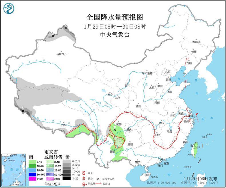 1月29日08時至30日08時,新疆北疆北部和西部、西藏西部和南部等地的部分地區有小到中雪或雨夾雪,局地有大雪。四川南部、貴州西部、雲南東部、台灣島等地的部分地區有小雨。東北地區南部、山東半島、江南東北部等地的部分地區有4~6級風。