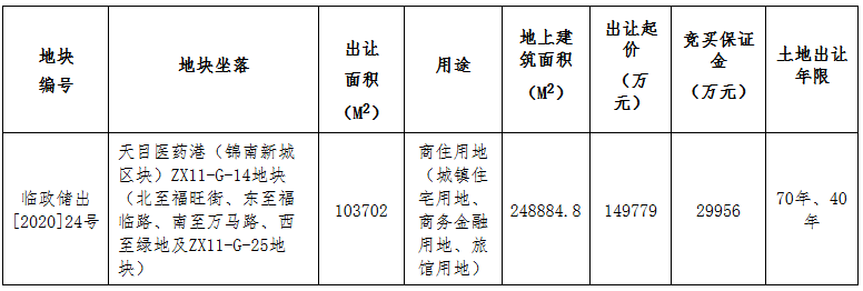 資料显示,該地塊編號為臨政儲出[2020]24號,位於臨安區,北至福旺街、東至福臨路、南至萬馬路、西至及ZX11-G-25地塊。出讓面積103702㎡,起始價149779萬元,上限價格193779萬元,競買保證金29956萬元,建築密度≤27%,綠地率≥32%,建築高度≤100米(住宅建築高度≤80米)。