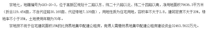 地塊編號為GX3-20-3,位於高新區規劃十二路以東、緯二十六路以北、緯二十四路以南,凈用地面積79636.3平方米(摺合119.454畝,不含代征路30.165畝、代征7.109畝),用地性質為住宅用地,容積率不大於2.8,建築密度不大於20%,綠地率不小於35%,土地使用年期為七十年。
