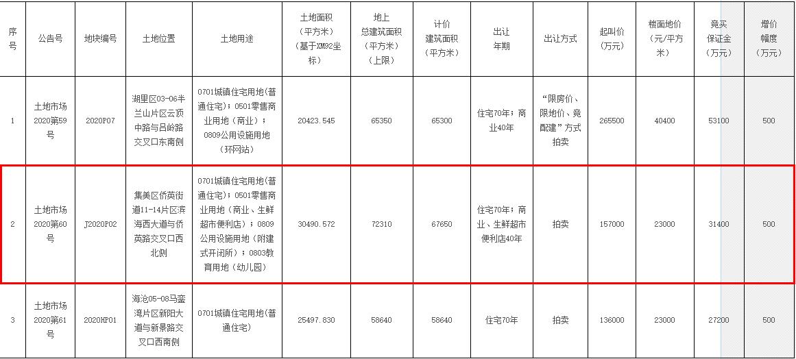 地塊編號J2020p02,地塊位於集美區僑英街道片區濱海西大道與僑英路交叉口西北側,出讓面積3.04萬平,建築面積6.76萬平,容積率2.2,土地性質為0701城鎮住宅用地(普通住宅);0501零售商業用地(商業、生鮮超市便利店);0809公用設施用地(附建式開閉所);0803教育用地(幼兒園),起始價15.7億元。