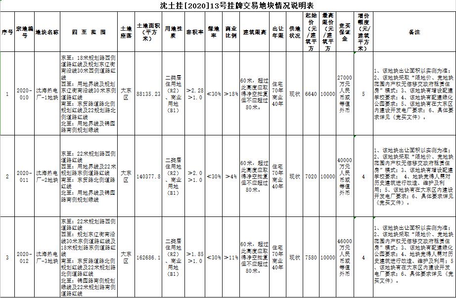地塊編號2020-012號,地塊名稱瀋海熱電廠-3地塊,地塊東至22米規劃路西側道路紅線;西至規劃東遼街南沿線30米東側道路紅線及18米規劃路東側道路紅線;南至東貿路道路北側規劃紅線及22米規劃路北側道路紅線;北至錦園路南側規劃綠線及22米規劃路南側道路紅線。土地用途為商住用地,起始價7580元/平。