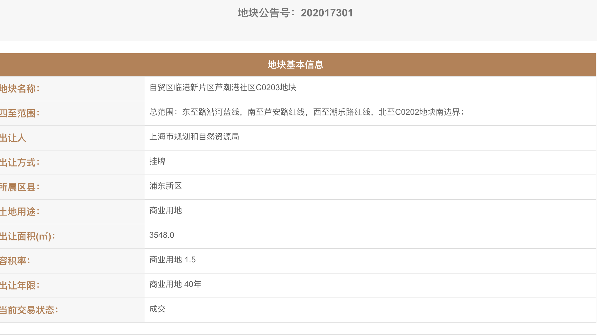 地塊編號202017301,地塊名稱自貿區臨港新片區蘆潮港社區C0203地塊,地塊東至路漕河藍線,南至蘆安路紅線,西至潮樂路紅線,北至C0202地塊南邊界,地塊位於浦東新區,出讓面積3548平,土地用途為商業用地,容積率1.5,出讓年限40年,起始價2360萬元。