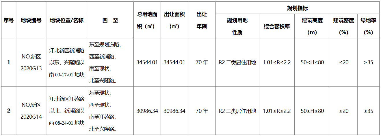 資料显示,該地塊編號為NO.新區2020G13,位於江北新區新浦路以東、興隆路以南,東至規劃道路,西至新浦路,南至現狀,北至興隆路。出讓面積34544.01㎡,起始價15.3億元,競買保證金7.65億元,建築密度≤20%,率≥35%,50米≤建築限高≤80米。