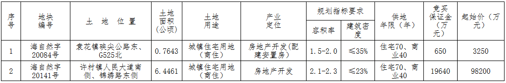 資料显示,該地塊編號為海自然字20141號,位於許村鎮人民大道南側、錦繡路東側。出讓面積64461㎡,起始價98200萬元,競買保證金19640萬元,建築密度≤23%。