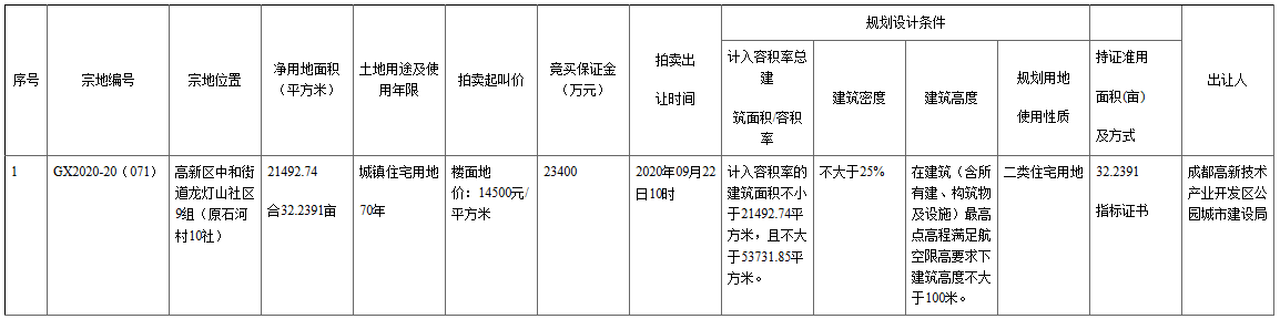 資料显示,該地塊編號為GX2020-20(071),位於高新區中和街道龍燈山社區9組(原石河村10社)。凈用地面積21492.74㎡(合32.2391畝),起始價77911萬元,競買保證金23400萬元,建築密度≤25%。