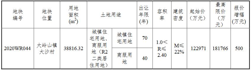 資料显示,該地塊編號為2020WR044號,位於大嶺山鎮大沙村。出讓面積38816.32㎡,起始價122971萬元,競買保證金30000萬元,最高限價181766萬元,增加幅度500萬元。